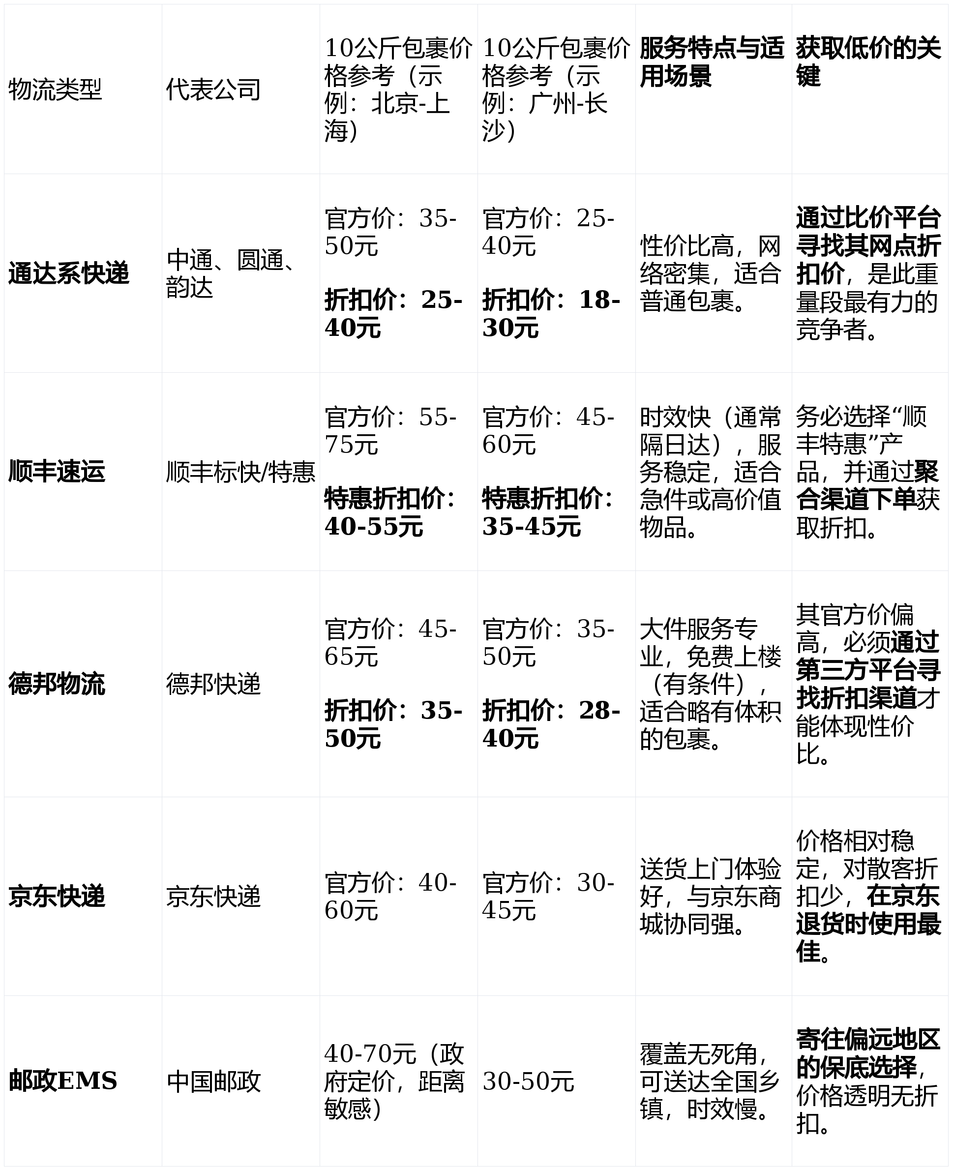 - 略有价值,求稳妥:如果德邦/顺丰的折扣价与最低价相差10元以内,建议选择它们。