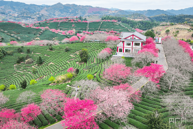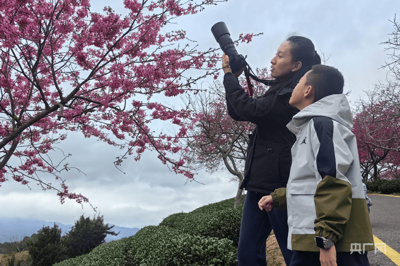永福台品樱花茶园的千亩花海。漫步于绯寒樱、中国红等42个品种的樱花树下,感受“茶绿樱红”的独特景观(央广网发 章宸睿 摄)