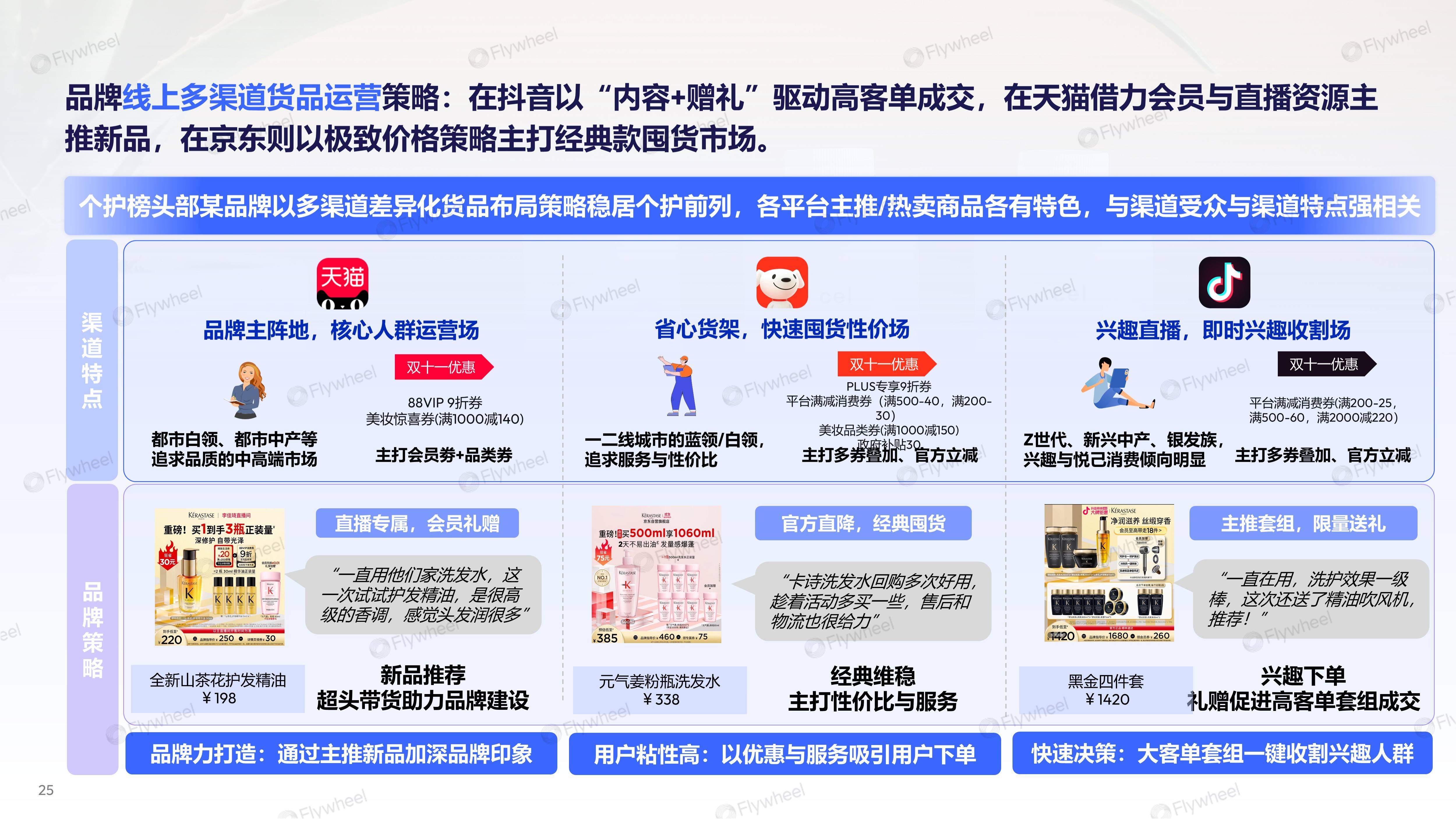 Flywheel飞未梳理了某个护榜头部品牌在双十一期间线上的货品机制设计,该品牌深刻洞察了不同平台的核心用户心智与消费场景,并据此进行了精准的差异化布局。