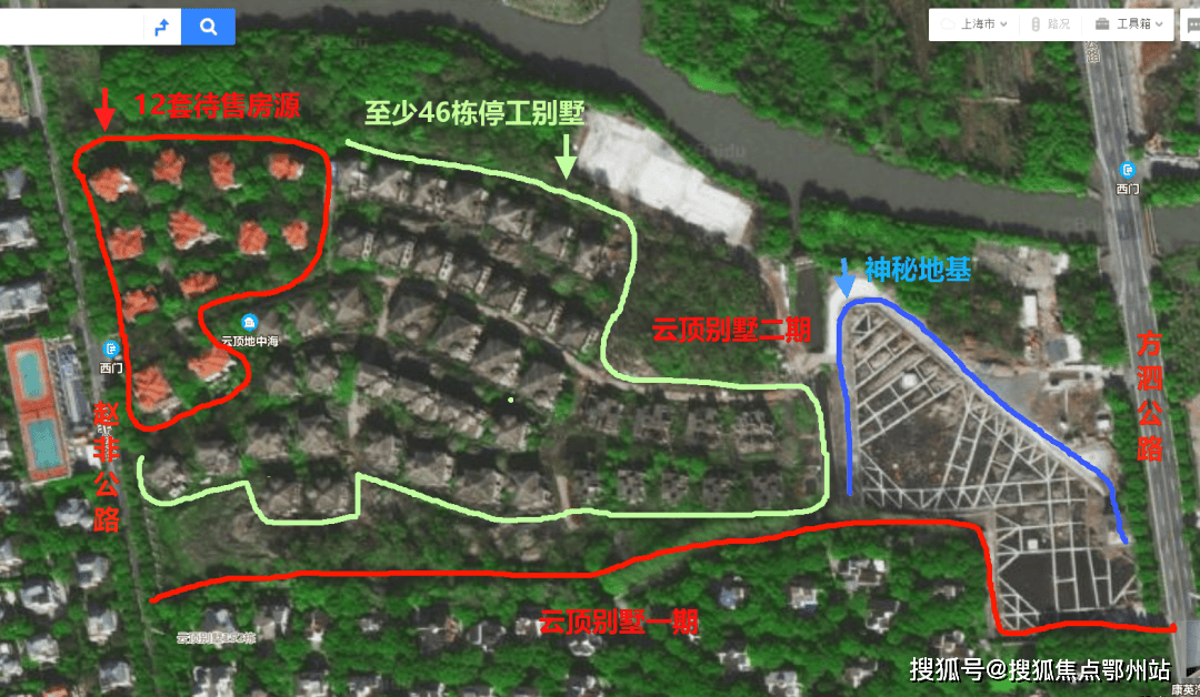 上海总是有这样的神奇神秘项目,不实地探访,根本发现不了这么多奥秘。这次待售的12套房源,只能算是云顶别墅二期西侧的一小块位置,更多的至少46套建造荒废的独栋别墅静默中,不知道开发商是否在后续会重启建造和陆续投入市场销售。二期东侧还有一片神秘地基。