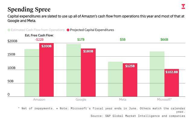 亚马逊不会面临同样的问题,因为它自2022年以来就没有回购过股票,也从未支付过股息。但根据标普全球市场财智的数据,其今年预计的 2000亿美元资本支出,将超过分析师估计的1780亿美元运营现金流,这意味着与其他公司不同,亚马逊无论如何都会消耗现金。