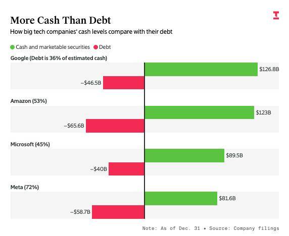 与亚马逊类似,Meta 和谷歌去年都发行了债券以充实现金储备。这三家公司都仍拥有充足的借贷空间。以谷歌为例:标普信用评级机构去年 11 月指出,该公司可将"净债务提升至超过 2000 亿美元"而不会导致其 AA+的优质信用评级被下调。谷歌目前负债 470 亿美元,但被其 1270 亿美元的现金储备完全覆盖,这意味着该公司实际上没有净债务。