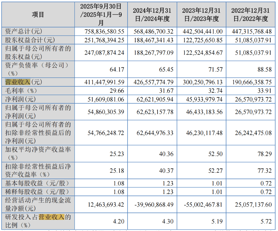 从2022年至2024年以及2025年1-9月份(以下简称报告期),华汇智能的营业收入分别为1.91亿元、3.00亿元、4.27亿元和4.11亿元,同期净利润分别为2657.10万元、4593.40万元、6262.19万元、5160.91万元,该公司的经营活动净现金流分别为2505.71万元、-5500.25万元、-3996.09万元、1246.37万元。