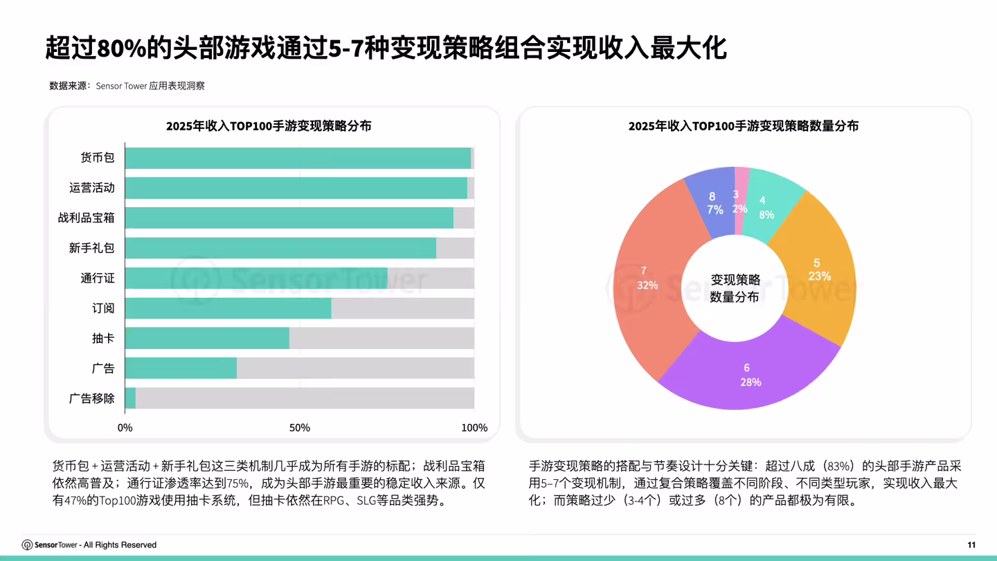 报告称,手游变现策略的搭配与节奏设计十分关键。2025 年全球收入排名前 100 的手游中,83% 的产品采用 5–7 个变现机制,通过复合策略覆盖不同阶段、不同类型玩家,激发玩法与经济体系的联动效应,从而实现收入和用户体验的最大化。而策略过少(3-4 个)或过多(8 个)的产品都较为有限。