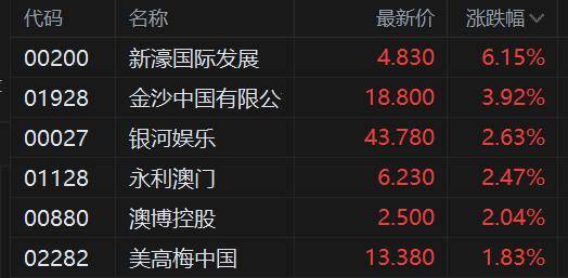 港股濠赌股集体拉升上涨,新濠国际发展涨超6%,金沙中国涨4%,银河娱乐、永利澳门涨2.5%,澳博控股、美高梅中国涨2%。