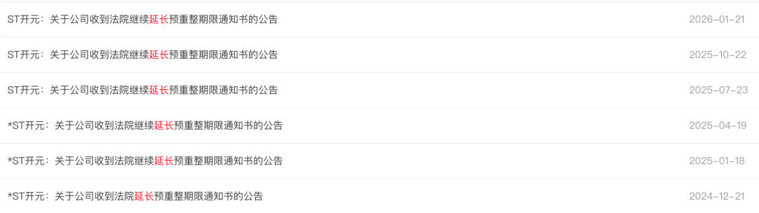然而,根据2026年1月21日公告,临时管理人第六次延期预重整进程,累计延期长达16个月之久。也就是说,1年半来,*ST开元始终没有正式进入重整程序。界面新闻致电上市公司,相关负责人表示“现在还是在向上呈报中,有进展的话会公告”。公司是否能进入重整,重整是否能顺利实施完毕,仍是未知之数。