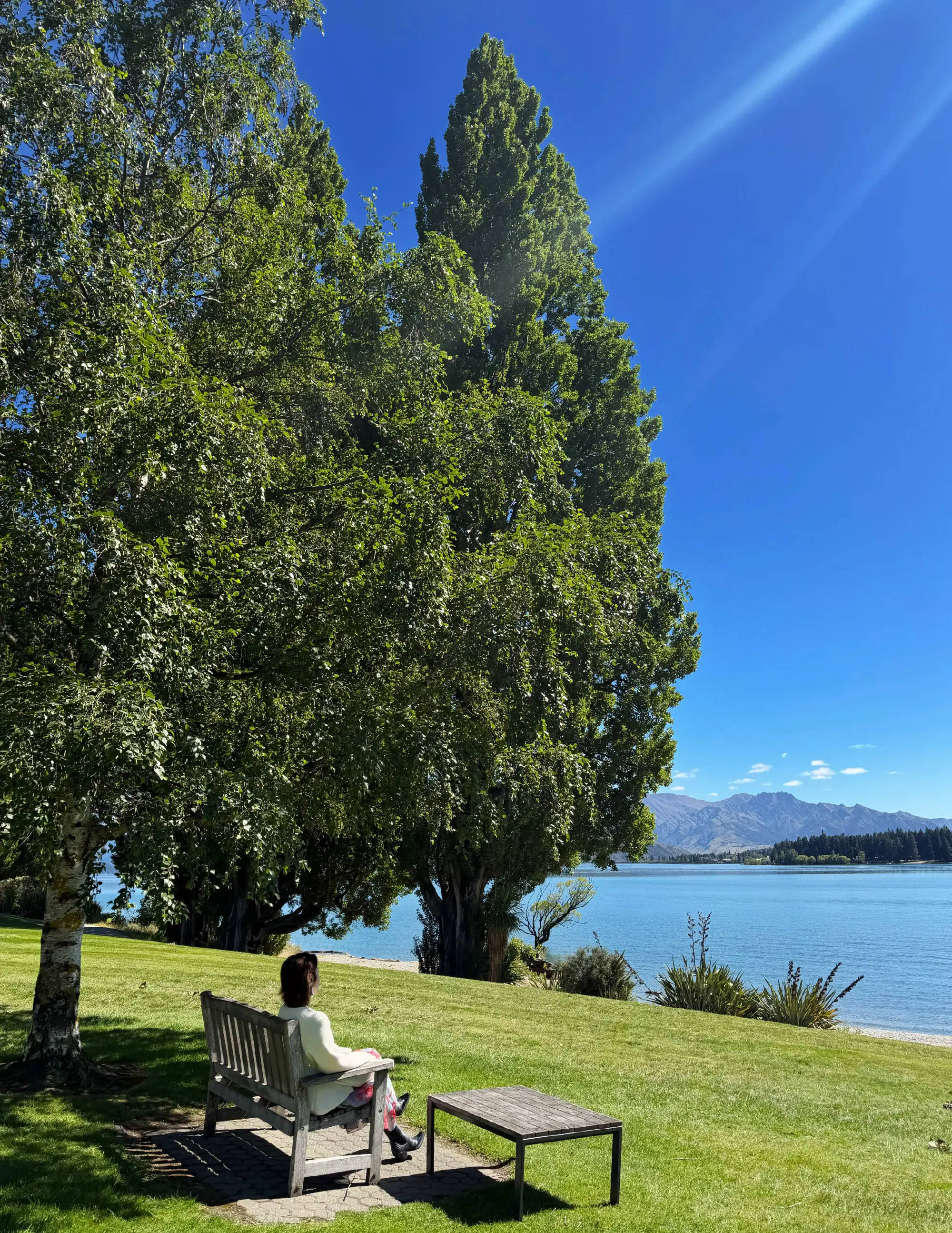 唐艺昕坐在长椅上欣赏美景,好惬意。