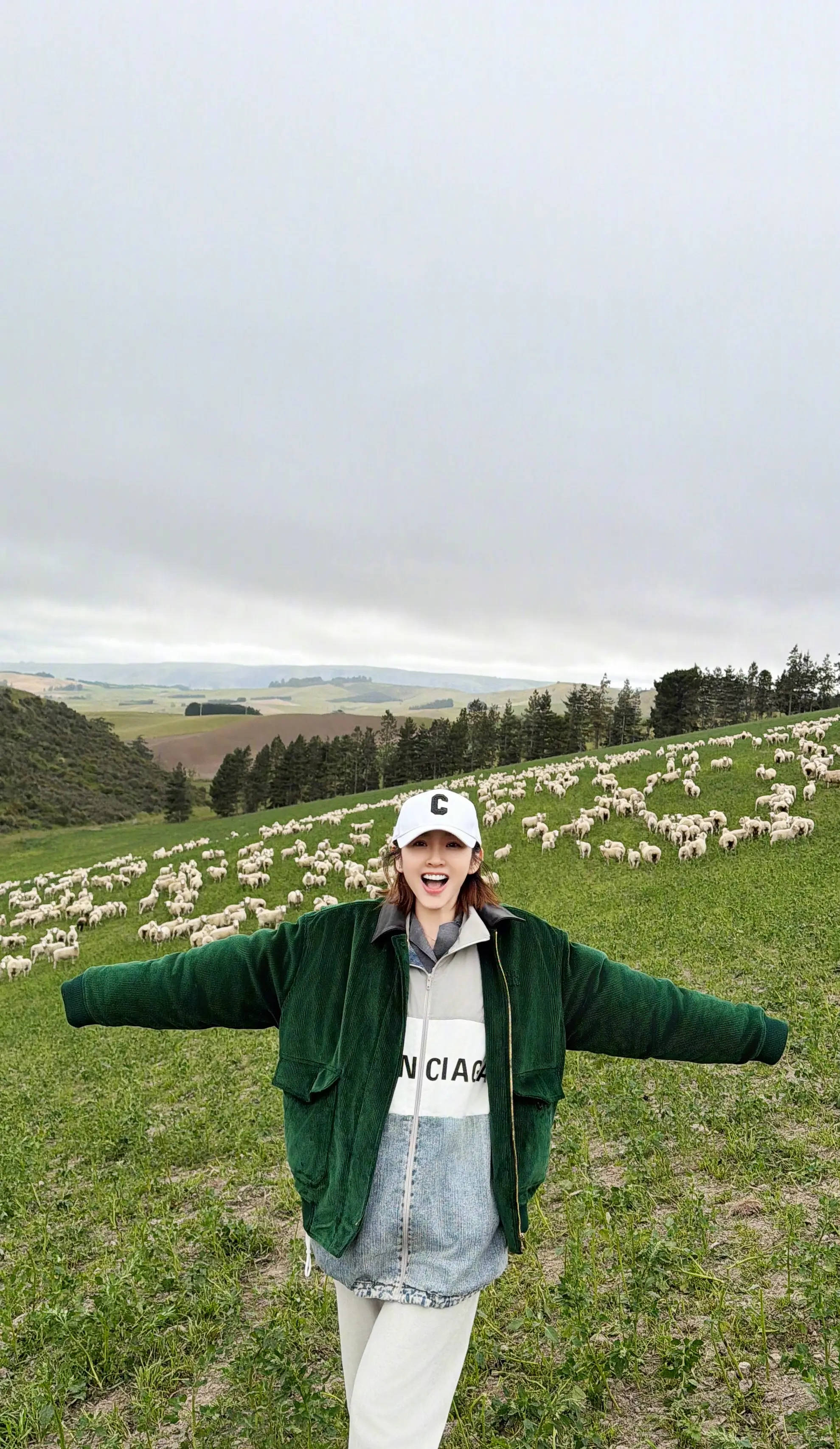 唐艺昕在大草原上与羊群合影。
