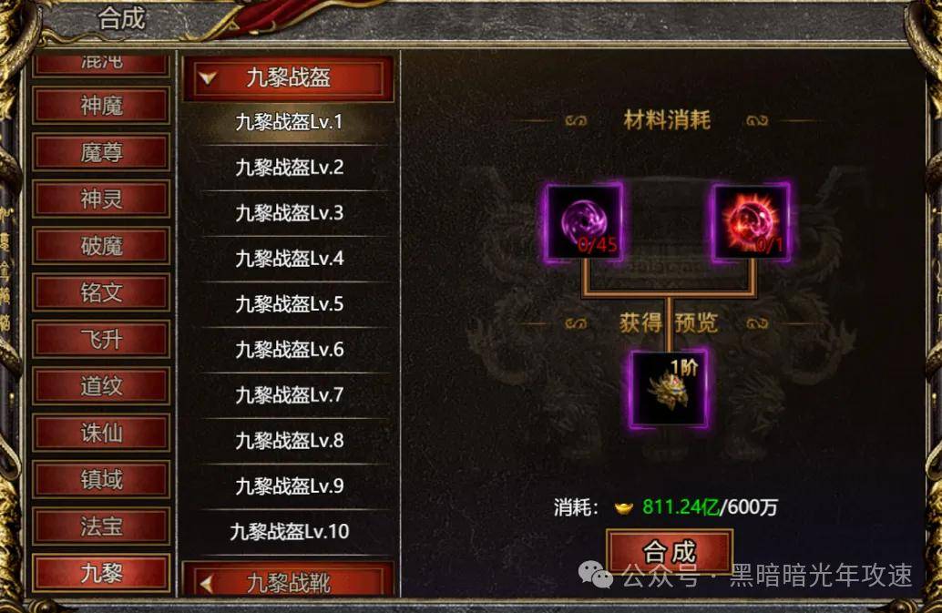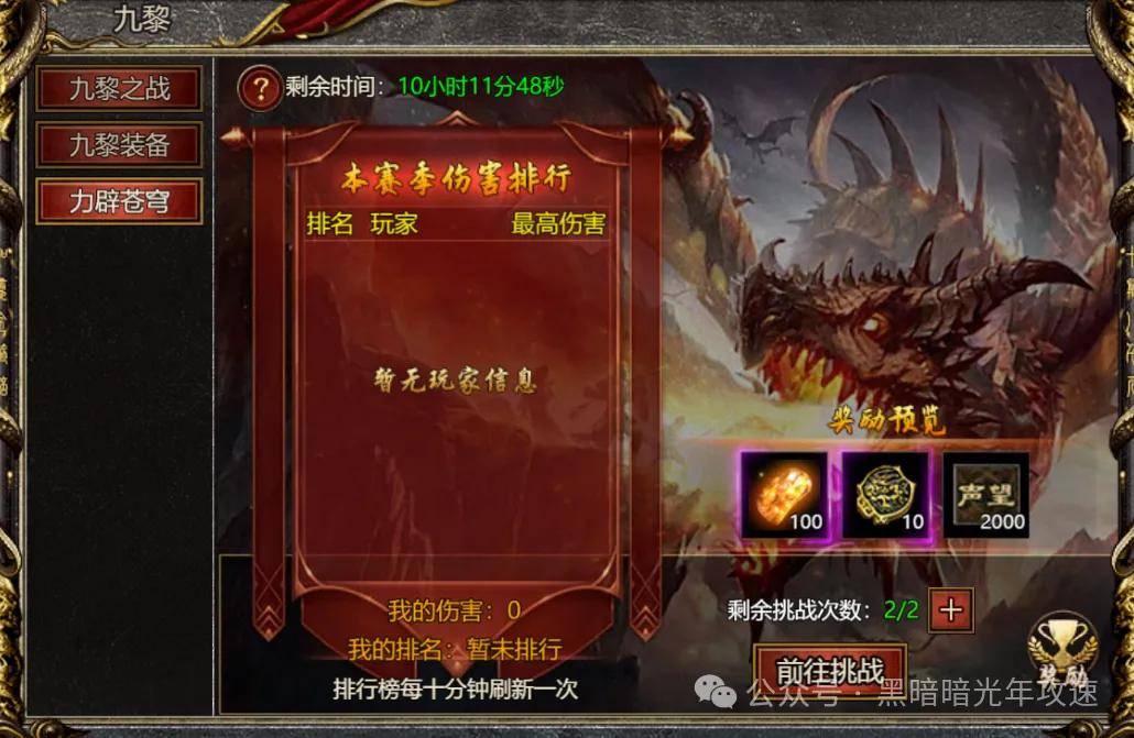 在黑暗光年里到开服150天,即可开启“九黎之战”。这玩法有点特别,是赛季制的,每7天一个循环,而且所有玩家进去后属性都将会被平衡为统一属性且大部分特技特效、BUFF均无法触发 (不含九黎之城地图),可通过击杀九黎BOSS掉落的九黎核心装备及九黎战装提升属性;
