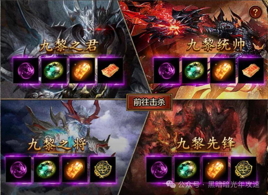 BOSS分层:每个战区都有4层,每层有四种BOSS,从强到弱是:九黎之君(1个)、统帅(1个)、战将(2个)、先锋(4个)。想进更高层,需要你身上 “九黎战装”的等级总和达标。