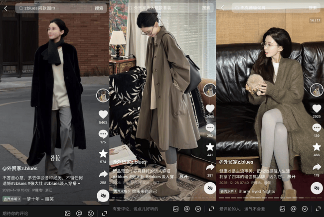 张大壮提起春季上新的节奏,她将在抖音电商@外贸家z.blues 账号里,把已经出货的产品,通过视频、图文以搭配的方式展现。这两种形式的展现有着清晰的定位:“图文是简洁直观的,老客户点开就能快速摸清新品的版型、面料与搭配;视频则是另一种表达,强化品牌格调,吸引更多同风格的新粉丝。”