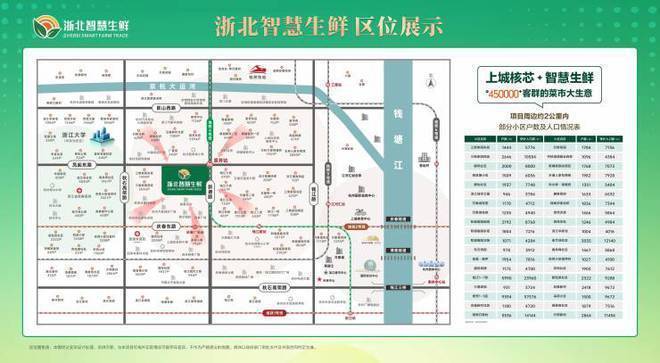 项目位于杭州市上城区凤起东路与新塘路交汇处,紧邻4号线景芳地铁站,属于主城核心位置,周边交通发达,出行方便,项目西侧仅靠秋石高架路,通往全城非常便捷,不仅如此项目周边还有多条公共线路贯穿整个杭州城区。项目位于凤起时代大厦负一楼,共计约5000平方,周边1.5 KM成熟小区共计106个,小区总户数约60000户,长期固定人口约30万左右,如果按人均每天 15 元的吃喝支出,1年消费额近 16 亿,按肉类每户每日需求 1斤 果蔬每日需求2斤,每日共需 60000 斤肉, 120000 斤果蔬,市场需求相当庞大。