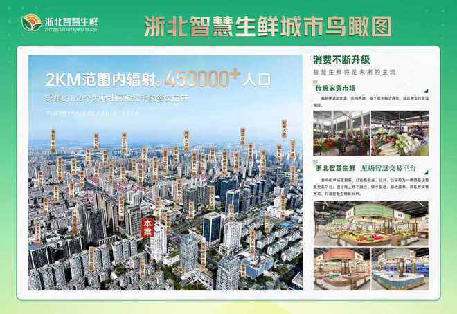 浙北智慧生鲜致力于打造杭州智慧、优惠、便捷的一站式生鲜集市。传统市场存在环境脏乱差、安全隐患等众多问题,尤其是农贸市场作为民生重点工程关乎千家万户的切身利益。浙北生鲜采用新主题、新形象、新模式、新设备/技术等作为运营模式打破目前市场上的产品参差不齐、服务差异,致力于打造杭州主城区品类齐全、购物体验感佳、配套全面的专业型智慧生鲜市场。