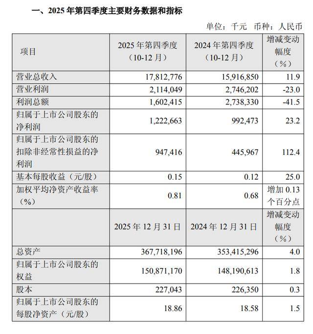 公司2025年全年营业收入为673.23亿元,上年同期为577.96亿元,同比增加16.5%;归属于上市公司股东的净利润为50.41亿元,上年同期为36.99亿元,同比增加36.3%;归属于上市公司股东的扣除非经常性损益的净利润为41.24亿元,上年同期为26.45亿元,同比增加55.9%;基本每股收益为0.15元,上年同期为0.12元,同比增加25.0%。