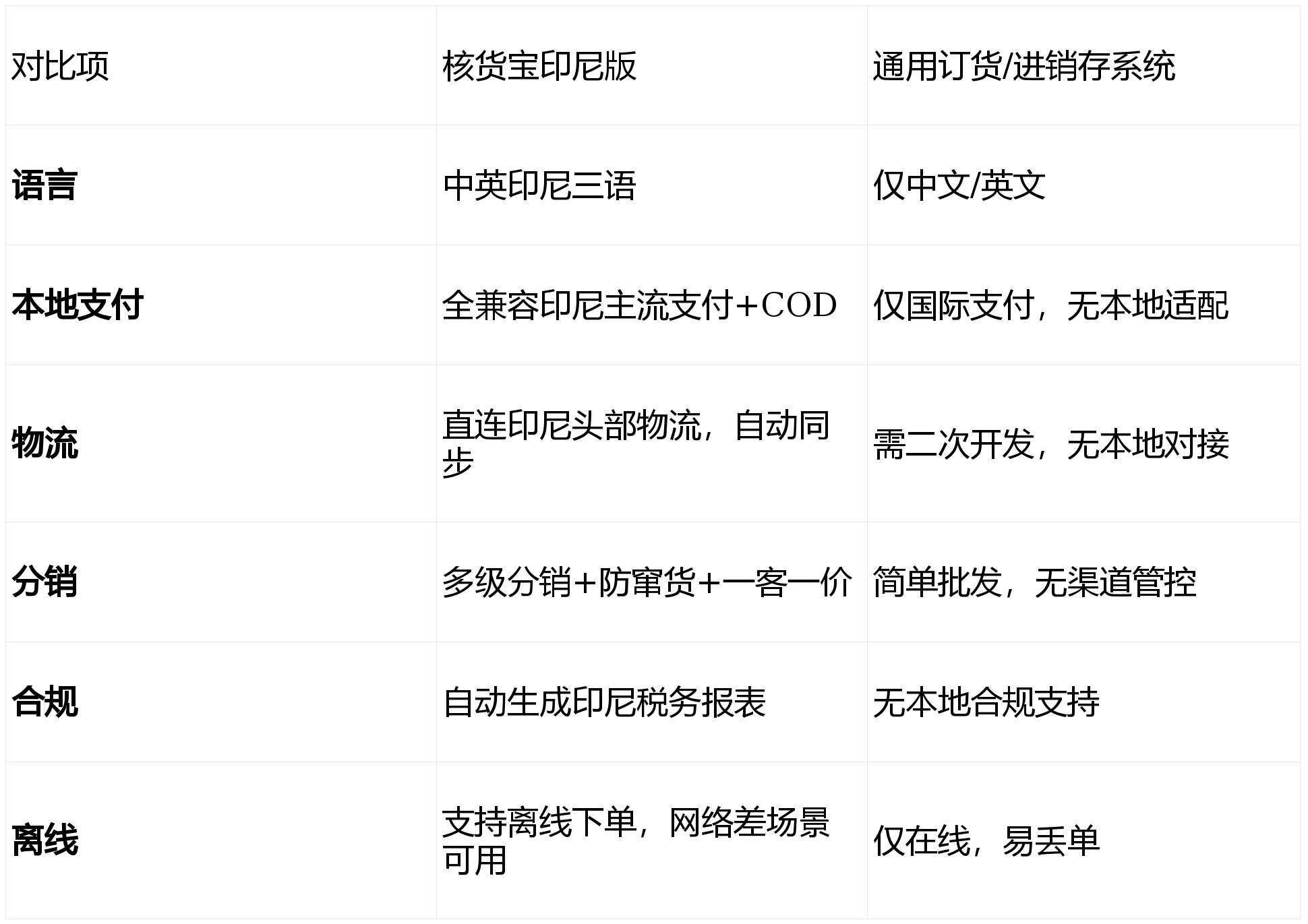 •本地深度适配:三语支持、印尼支付/物流直连、合规税务、离线下单