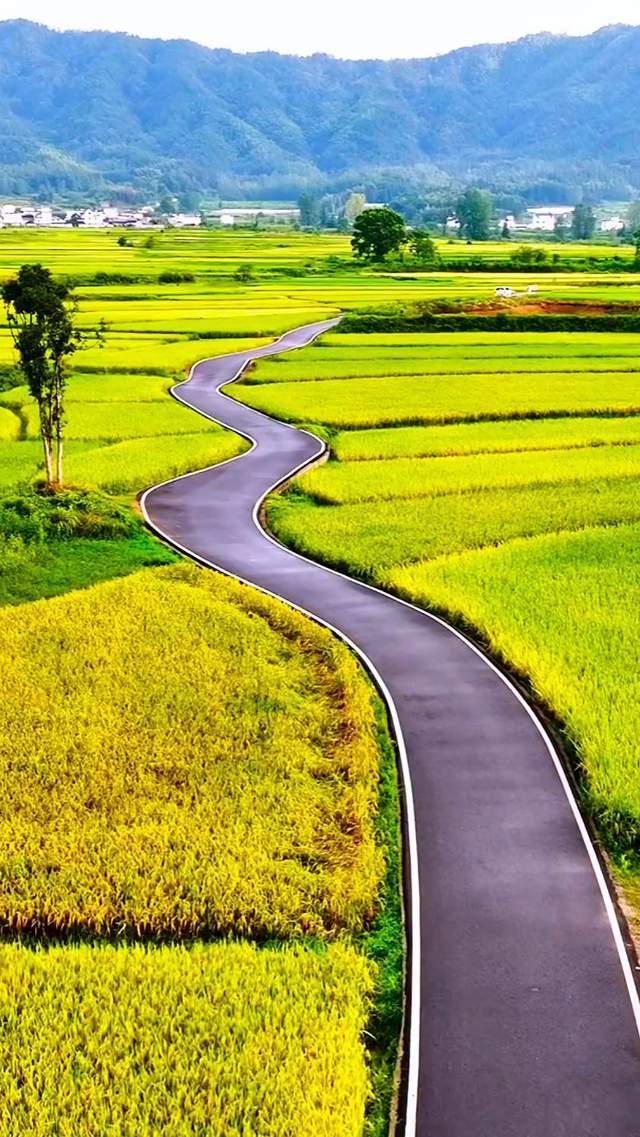 村外稻田“S”弯公路:秋季金黄稻田配蜿蜒小路,人像+全景拍摄都绝
