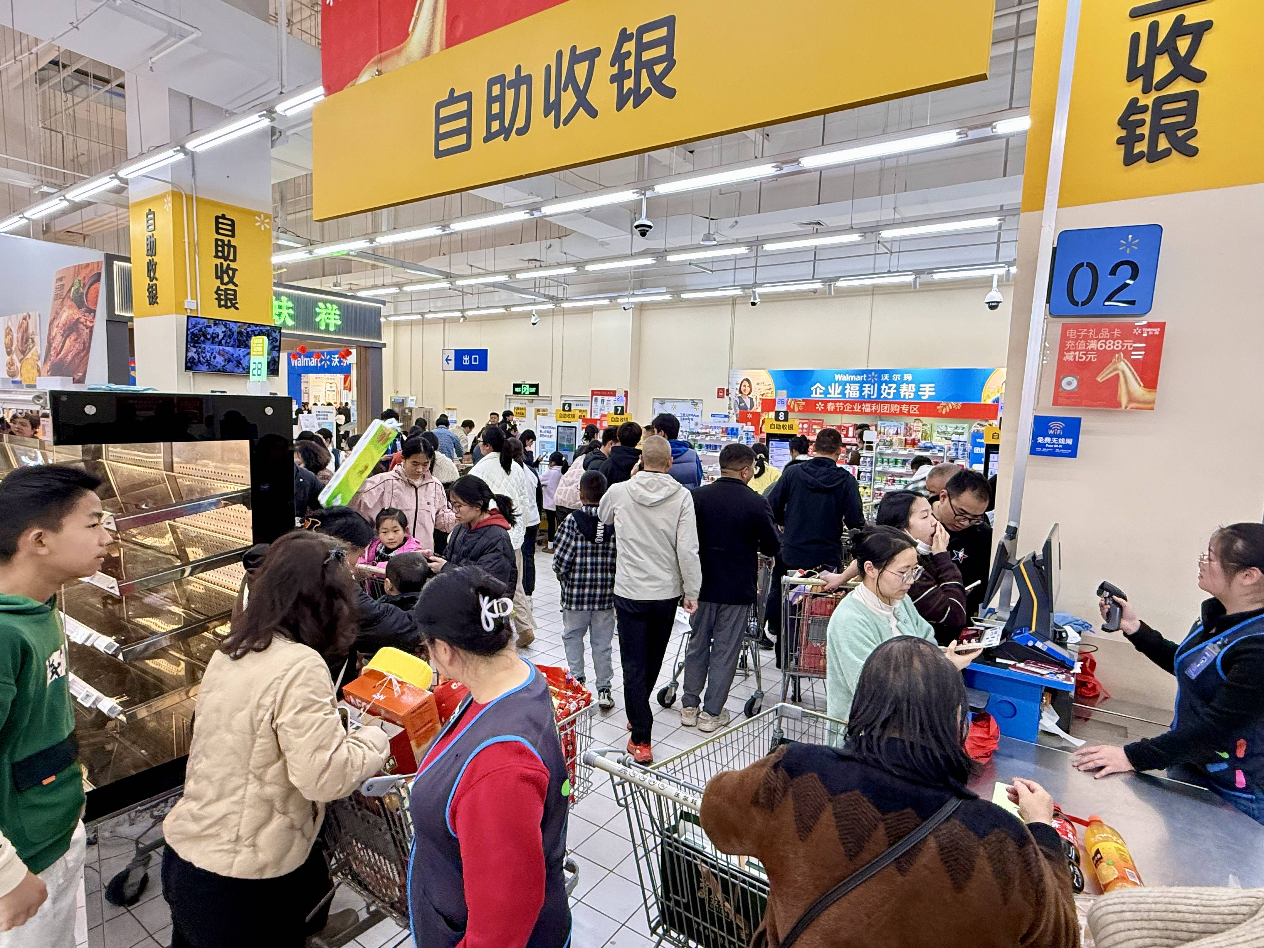 2月14日,春节长假前最后一个工作日。晚上8点左右,昆明呈贡某大型商超内人头攒动,生鲜区、零食区、礼盒区……每一个货架前都挤满了推着购物车的市民。无论是人工还是自助通道,收银台前排起了长队,几乎每辆手推车里都堆得满满当当。