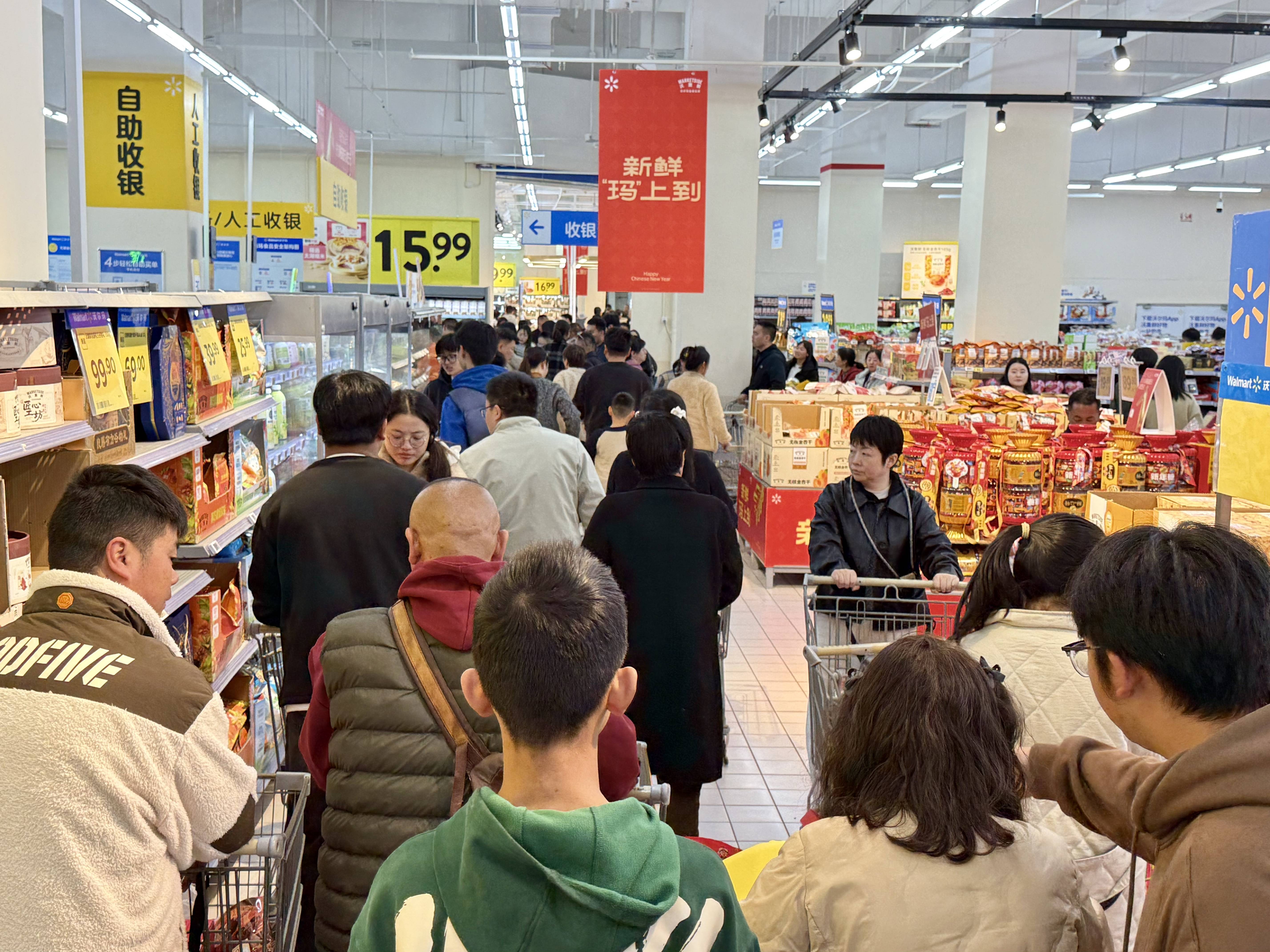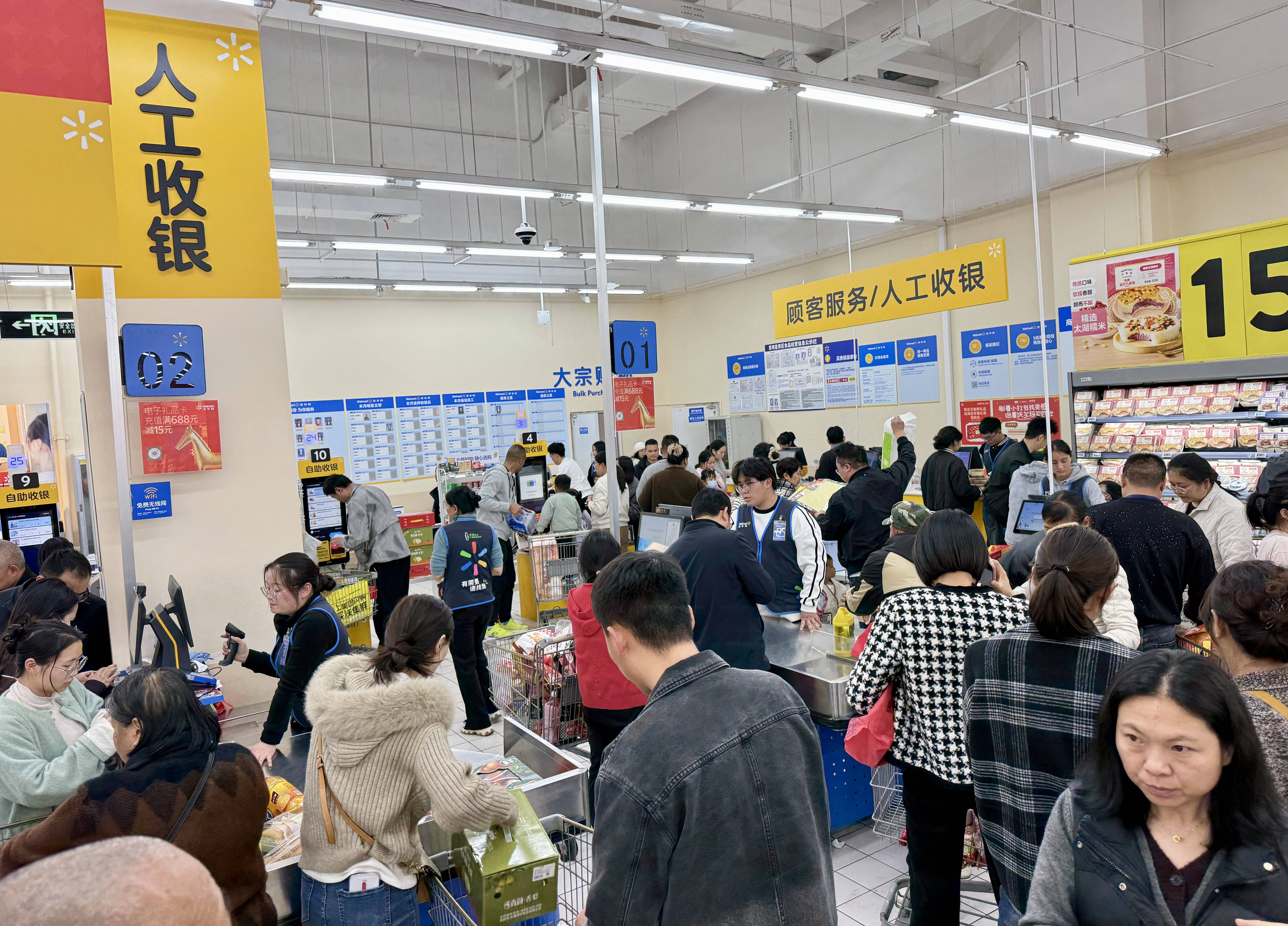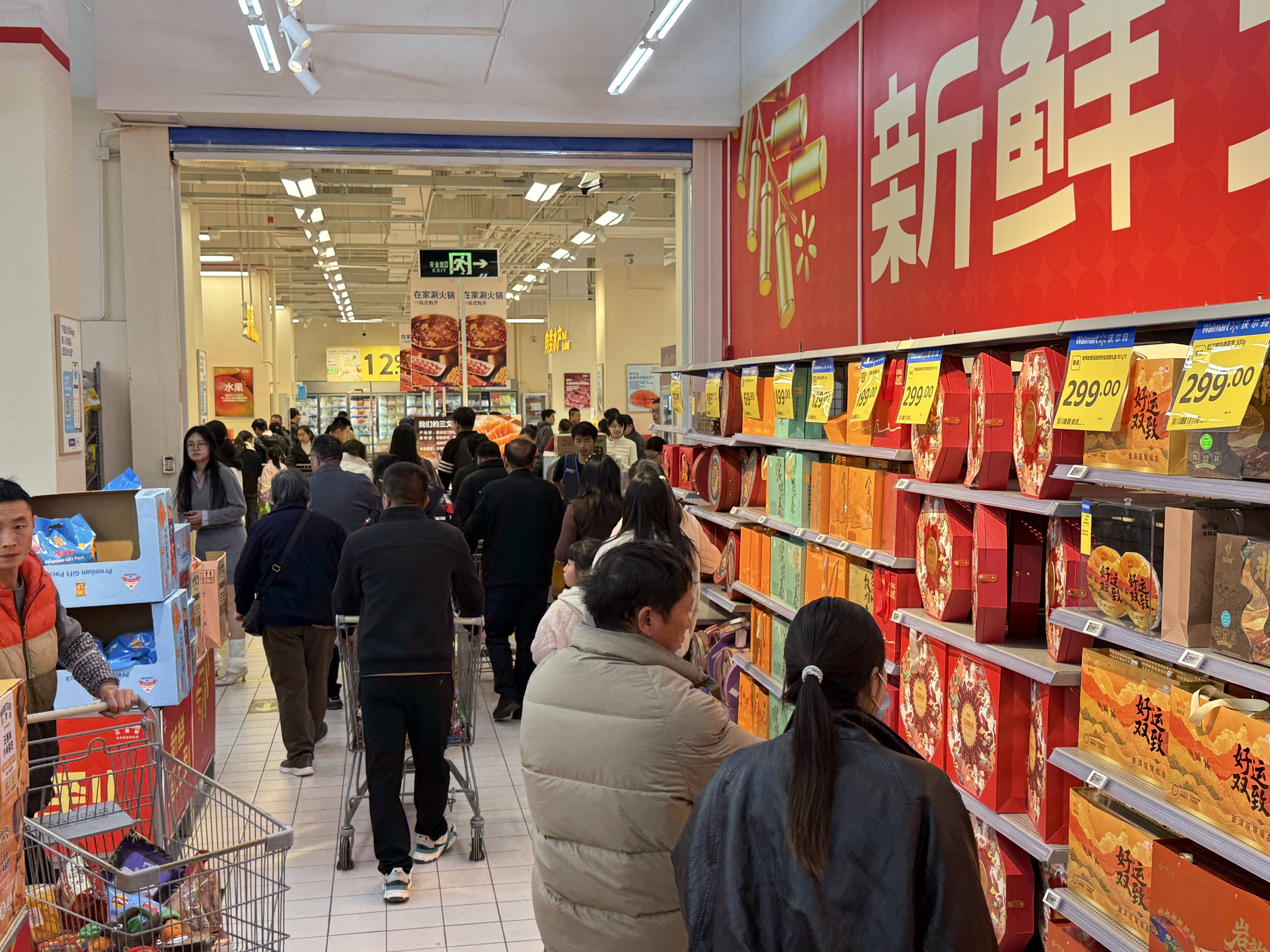 货架上的红色包装、广播里的拜年歌、人群中的欢声笑语——此刻的超市,是这座城市最热闹的角落,也是年味最浓的地方。