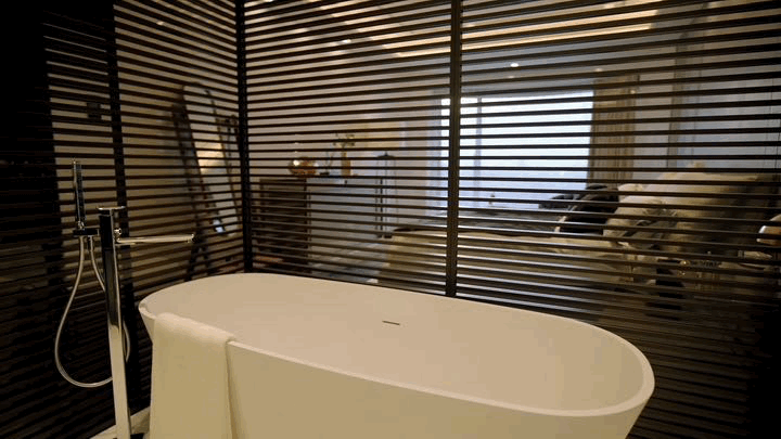卫生间选择浅色大理石作为地面,与原木色格栅相搭配,清新雅趣,带来轻松舒缓的心情。意大利ANTONIO LUPI的卫浴家具、瑞士Laufen的陶瓷卫浴产品、GESSI的龙头和卫浴配件等,都凸显了顶级质感。