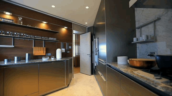 华山公寓厨房的空间设计皆打破传统理念,多边形走线充分利用了不同的角落。厨房中的Boffi顶级橱柜、由Sub-zero打造的嵌入式冰箱,以及Gaggenau的整套厨房电器,构造出空间流畅的线条。