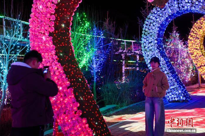 2月26日晚,民众打卡边麻沟花海景区新春灯会。位于海拔2800米的青海大通回族土族自治县朔北藏族乡边麻沟村,于2015年引进高原适生花卉,打造800亩“花海”景区,如今已发展成为集观景长廊、彩虹滑道、特色民宿于一体的知名旅游景区,助力乡村旅游热。中新社记者 薛蒂 摄
