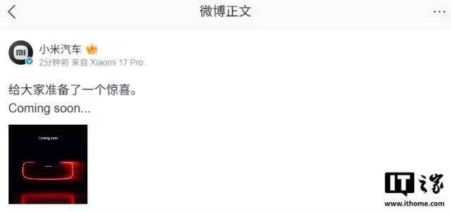 小米汽车今日(2 月 28 日)预告: “给大家准备了一个惊喜。Coming soon...”。雷军转发了这一消息,并配文:“明天见”。