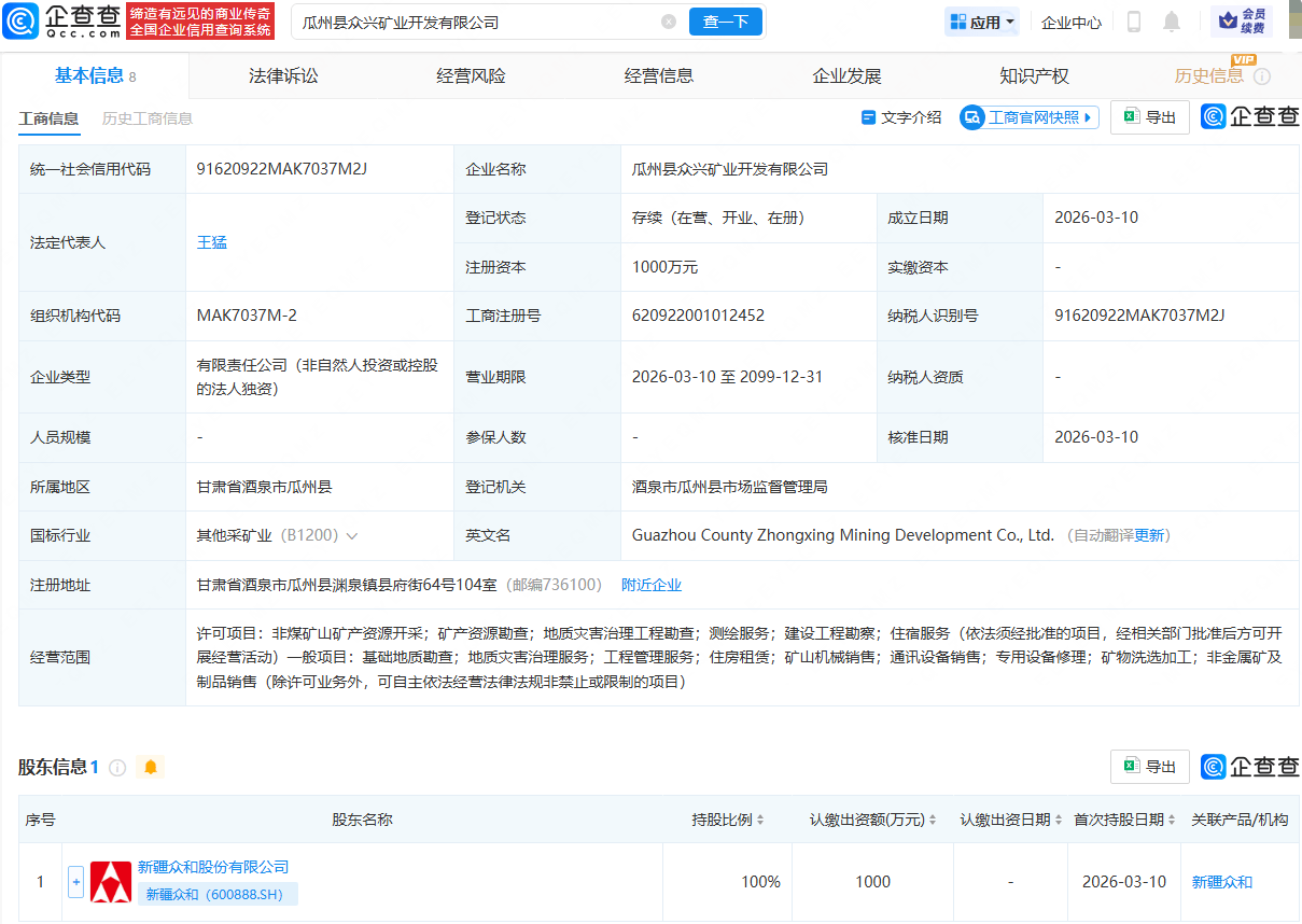 企查查APP显示,近日,瓜州县众兴矿业开发有限公司成立,法定代表人为王猛,注册资本为1000万元,经营范围包含:非煤矿山矿产资源开采;矿产资源勘查;地质灾害治理工程勘查;测绘服务;建设工程勘察等。企查查股权穿透显示,该公司由新疆众和(600888)全资持股。