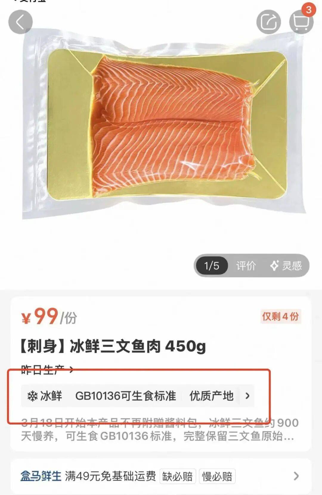 部分生鲜平台在三文鱼商品页特别加注“可生食GB10136标准”