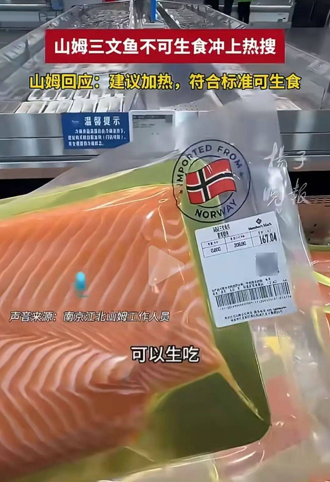 此外,据扬子晚报报道,山姆店内的工作人员也宣称该三文鱼“可生食、符合标准”。这一说法,让不少网友质疑其“口径双标”“营销误导”。