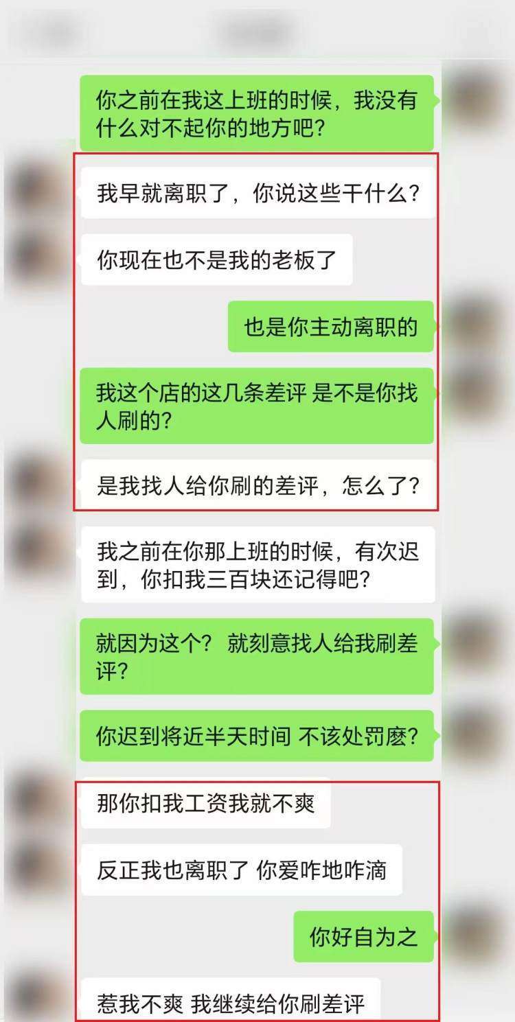 接报后,警方调查发现,嫌疑人通常会虚构、伪造“仅退款不退货,否则给差评”“发个红包删差评”等商户与消费者间的聊天记录,并在申诉时上传这些带有“威胁、敲诈”性质的对话,利用该平台审核机制漏洞删帖。例如,在某条申诉中,民警发现里面有多名“离职员工”恶意投诉商户的对话,而这些其实都是嫌疑人“自导自演”的,目的是混淆事实、顺利删除差评。