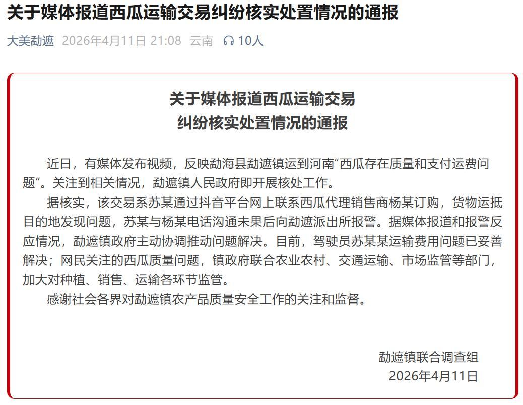 针对此事,云南省西双版纳州勐海县勐遮镇联合调查组于发布了关于该西瓜运输交易纠纷的核实处置情况通报:据核实,该交易系苏某通过网络平台网上联系西瓜代理销售商杨某订购,货物运抵目的地发现问题,苏某与杨某电话沟通未果后向勐遮派出所报警。据媒体报道和报警反映情况,勐遮镇政府主动协调推动问题解决。目前,驾驶员苏某某运输费用问题已妥善解决;网民关注的西瓜质量问题,镇政府联合农业农村、交通运输、市场监管等部门,加大对种植、销售、运输各环节监管。