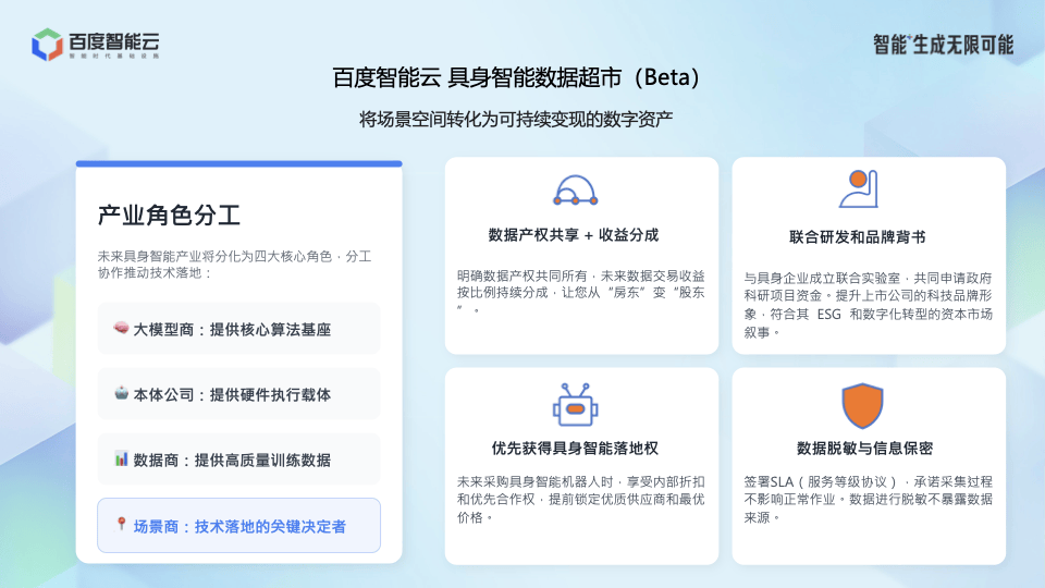 技术的最终目的在于赋能业务。百度智能云推出具身智能数据超市,核心在于为产业链上的不同角色,提供切中痛点的商业闭环与赋能体系: