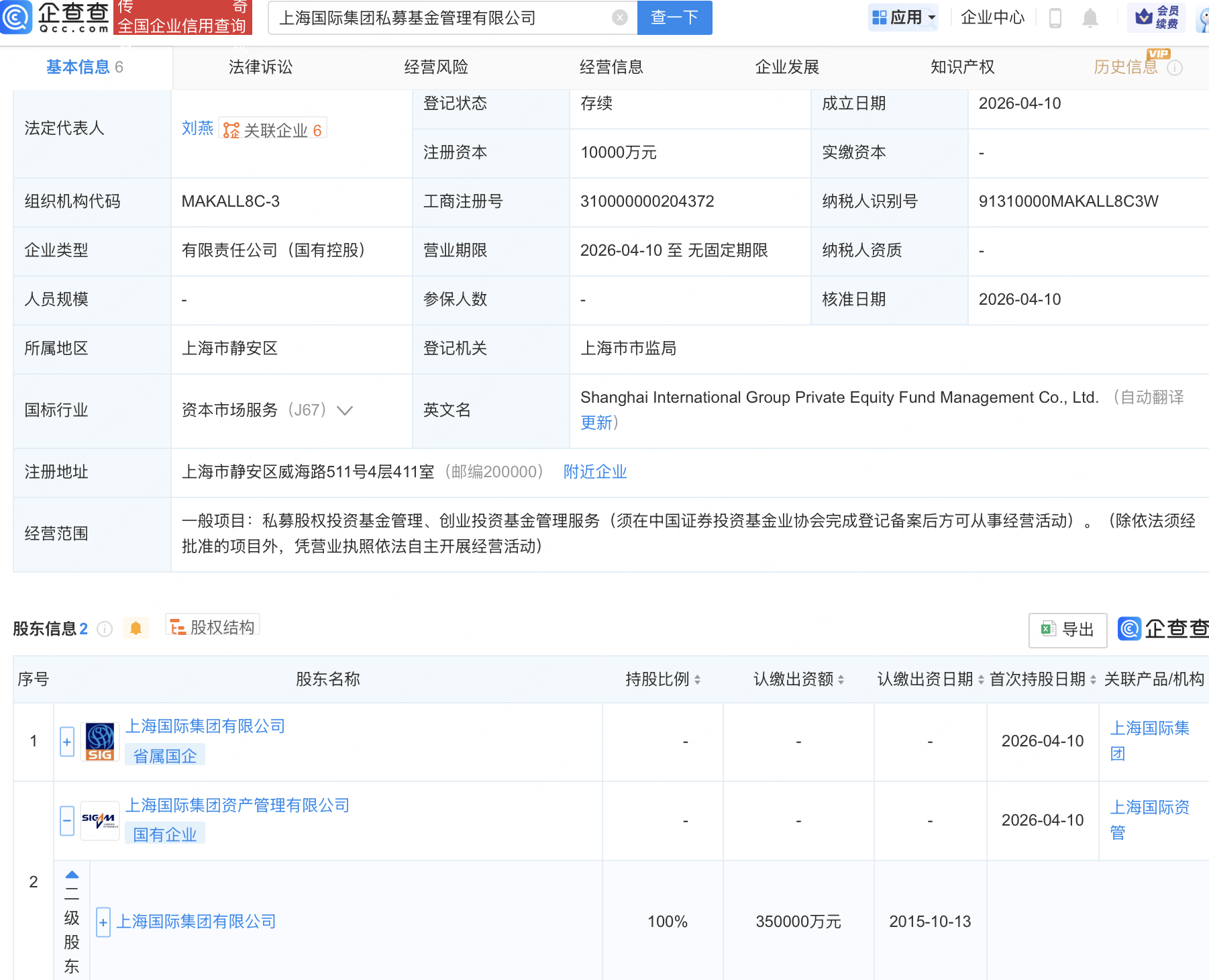 企查查APP显示,近日,上海国际集团私募基金管理有限公司成立,注册资本1亿元,经营范围包含:私募股权投资基金管理、创业投资基金管理服务。企查查股权穿透显示,该公司由上海国际集团有限公司间接全资持股。