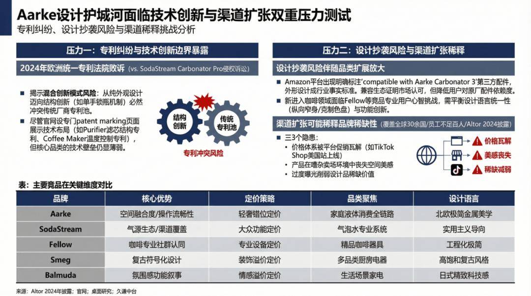 纯粹的工业设计很难建立坚不可摧的商业壁垒。2024年Aarke在欧洲统一专利法院与SodaStream的侵权诉讼中败诉,直接暴露了设计溢价模式的脆弱性。竞争对手完全可以通过规避外观专利来复制核心功能,用更低的价格抢占市场份额。当核心技术掌握在行业巨头手中时,仅靠不锈钢材质和极简线条无法阻挡平价替代品的围剿。
