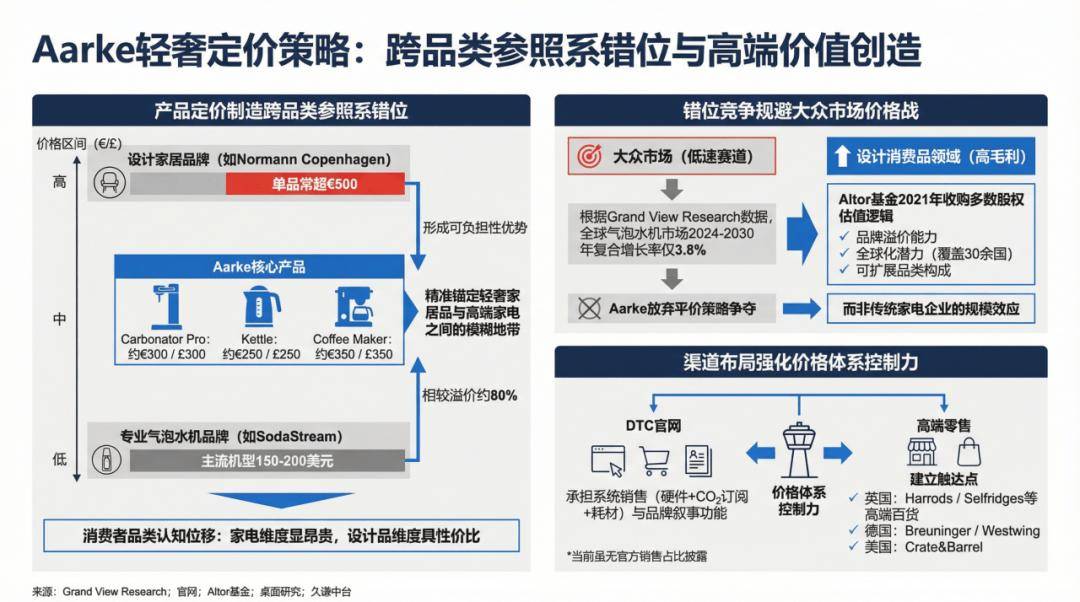 全球气泡水机市场年复合增长率仅为3.8%。瑞典品牌Aarke却把单价卖到竞品的近两倍,不仅拿下顶级基金Altor的投资,还把产品铺进全球30多个国家的奢侈品百货。把厨房小家电当成艺术展品来卖,这种依靠设计溢价的商业模式真的能跨越低频消费的死亡谷吗?