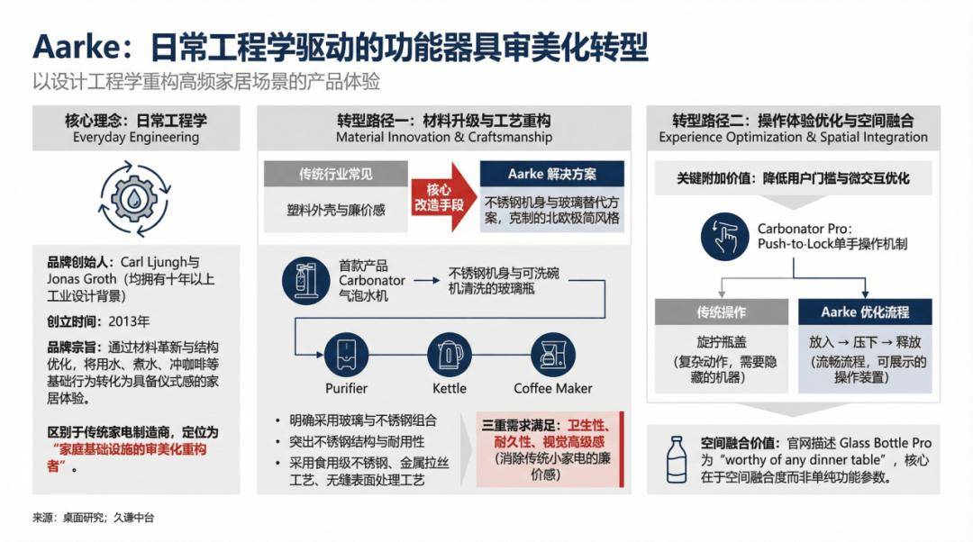 材料升级是品牌摆脱低端价格战的核心手段。在首款产品Carbonator气泡水机中,Aarke采用不锈钢机身与可洗碗机清洗的玻璃瓶,直接抛弃了行业常见的塑料外壳。此后的产品线普遍延续不锈钢主材与克制的北欧极简风格,Purifier净水器明确采用玻璃与不锈钢组合,Kettle温控壶和Coffee Maker咖啡机则更突出不锈钢结构与耐用性。