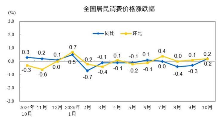 10月份,全国居民消费价格环比上涨0.2%。其中,城市上涨0.2%,农村上涨0.1%;食品价格上涨0.3%,非食品价格上涨0.2%;消费品价格上涨0.2%,服务价格上涨0.2%。