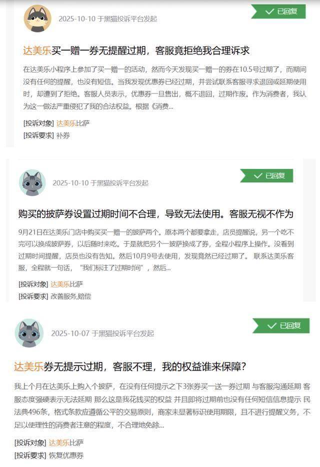 截止10月14日,黑猫投诉平台上,关于达美乐披萨的投诉累计达800条,内容包括优惠券悄无声息过期导致无法使用;不开发票;服务态度不好;食品安全等等。其中,优惠券悄无声息过期的情况较为普遍,许多消费者反映在不知情的情况下,优惠券就已失效,影响了消费体验。
