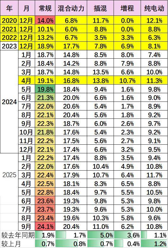 合资燃油车的促销从2023年的13%的低位,2024年3-9月进一步大幅增长到23%,今年9月回升到23.3%,促销力度相对平稳微增。