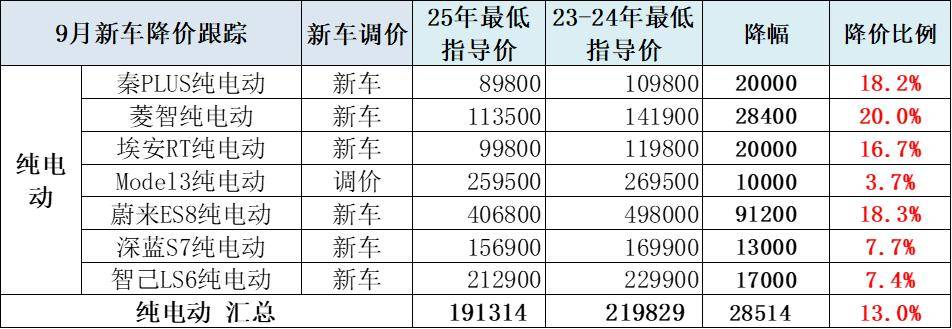 2025年9月份纯电动车型新车降价的均价是19万元,降价幅度达到2.8万元,新车降价力度达到13%。今年9月的纯电动的降价规模总体也是很大的,尤其是部分车型指导价的下探的降价达到10%以上,根据竞品调整,其价格下探的力度还是很惊人的。