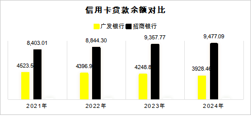 财报显示,2021年末至2024末,广发银行的信用卡贷款余额分别为4523.5亿元、4396.9亿元、4248.8亿元、3928.46亿元。
