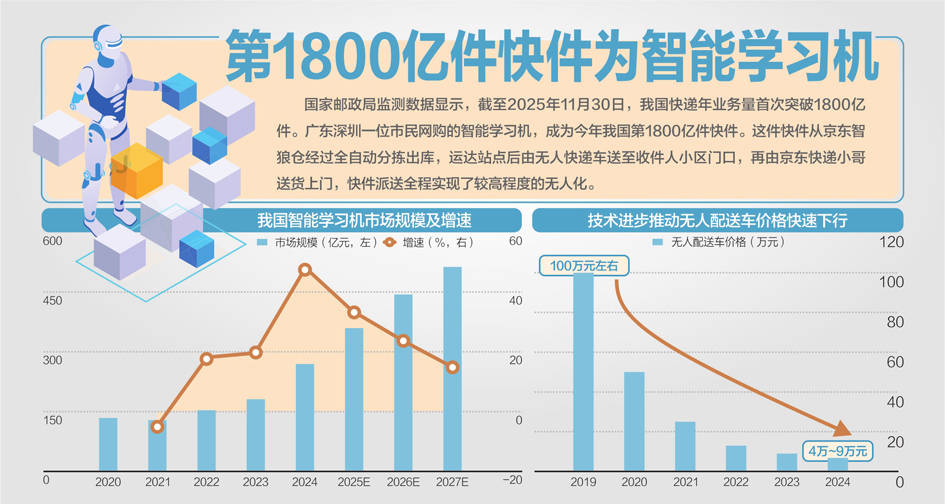 12月1日,国家邮政局监测数据显示,截至2025年11月30日,我国快递年业务量首次突破1800亿件。这件快递是深圳市一位市民网购的智能学习机,从京东智狼仓发出,经无人快递车运输,由快递员送货上门。