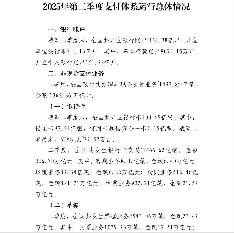 数据显示,截至二季度末,全国共开立银行账户152.38亿户。开立单位银行账户1.16亿户,其中,基本存款账户8075.15万户;开立个人银行账户151.22亿户。