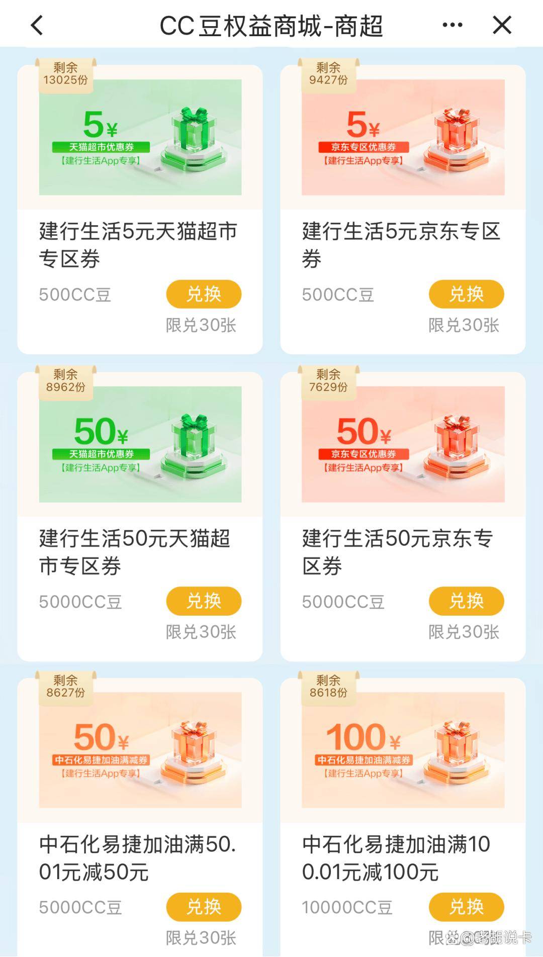 CC豆可兑换猫超卡、京东E卡、油卡等,每个任务可完成一次,老胡只有一张大山,撸完5000豆换50元油卡下车。