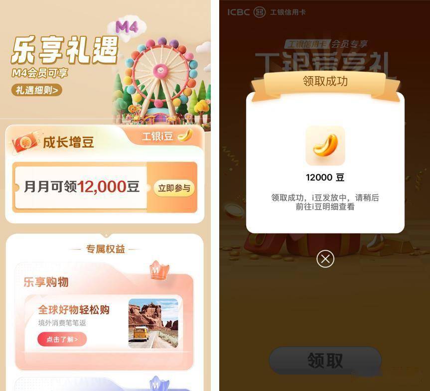 工银爱享礼现在根据会员等级领取 i 豆 ,老胡现在是M4等级,可以领1.2万豆,价值12元,也不错。