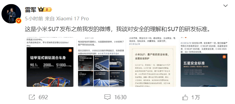 11 月 16 日,雷军多次发文表示:小米汽车注重安全。