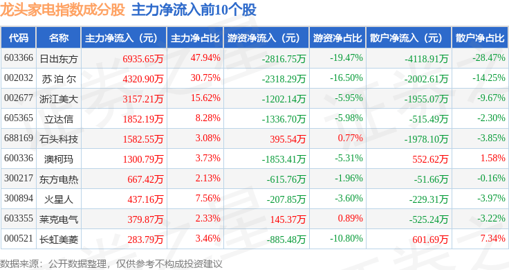 资金流向方面,龙头家电(980028)指数成份股当日主力资金净流出合计10.41亿元,游资资金净流入合计2.35亿元,散户资金净流入合计8.05亿元。成份股资金流向详情见下表: