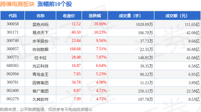 从资金流向上来看,当日跨境电商板块主力资金净流入30.14亿元,游资资金净流出21.31亿元,散户资金净流出8.83亿元。跨境电商板块个股资金流向见下表:
