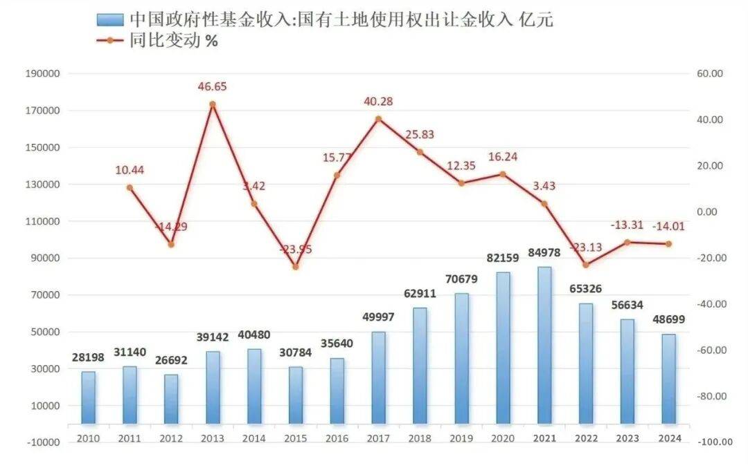 卖地收入下降7.4%,是趋势,不是偶然。数据显示,2024年全国土地出让金收入为48699亿元,较2021年的高峰时期(8.7万亿元)已经下滑了44%。