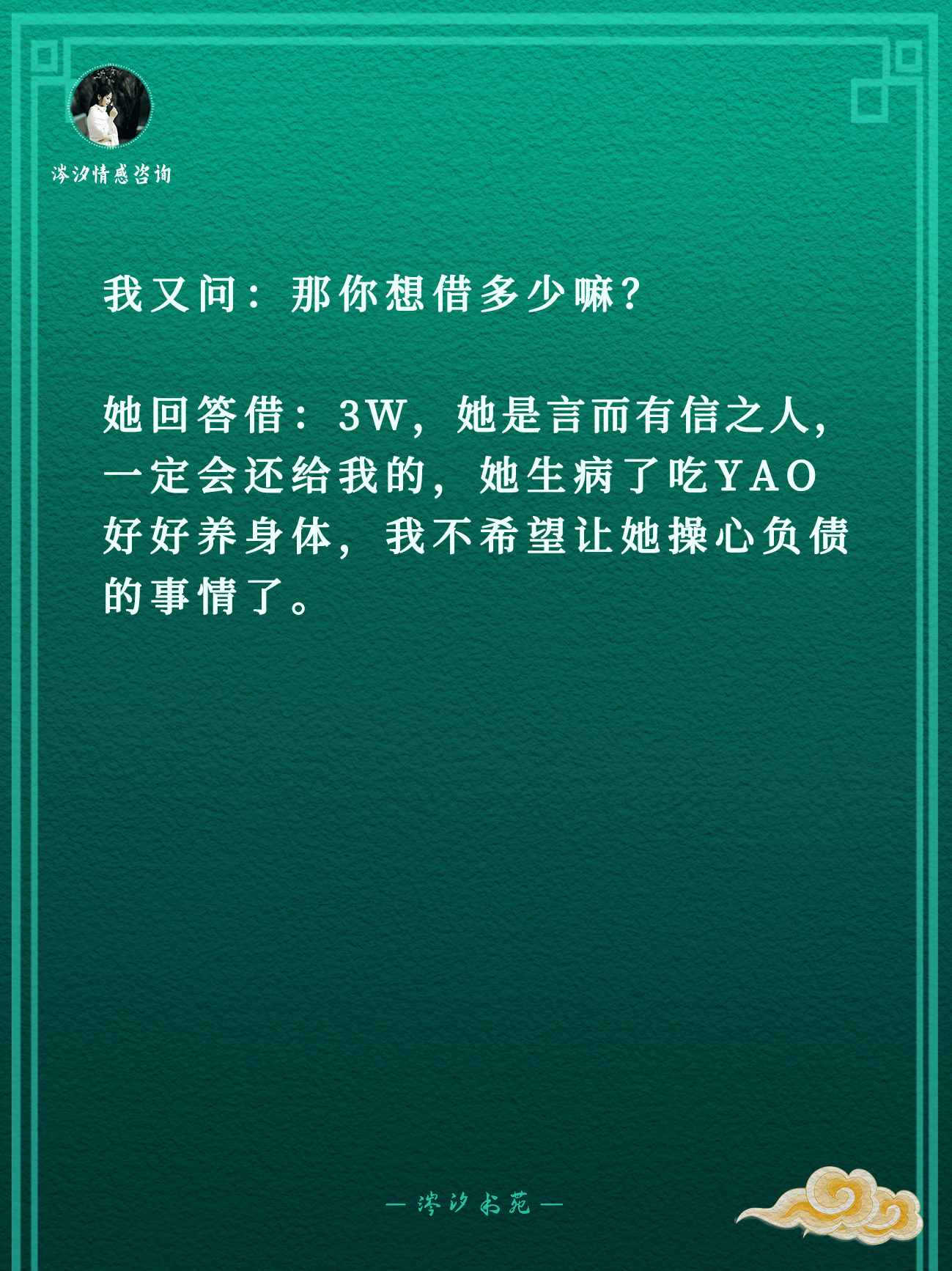 我又问:那你想借多少嘛? 她回答借:3w,她是言而有信之人,一定会还给我的,她生病了吃yao好好养身体,我不希望让她操心负债的事情了。